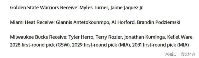 雄鹿收获:泰勒·希罗+特里·罗齐尔+乔纳森·库明加+凯勒布·韦尔+2028年勇士首轮签+2029年热火首轮签+2031年热火首轮签
